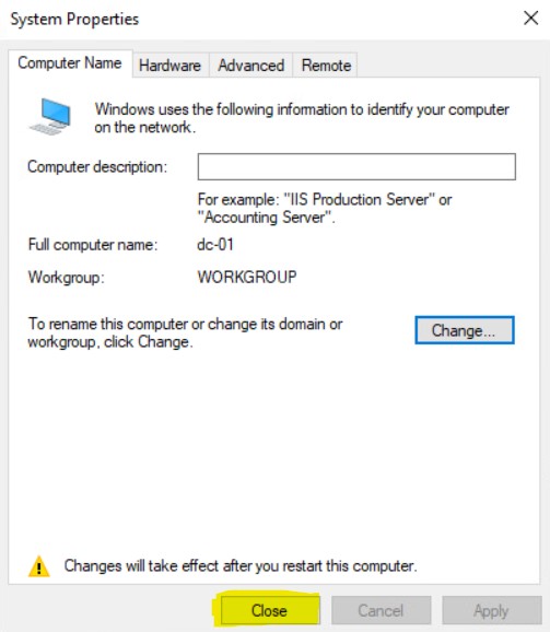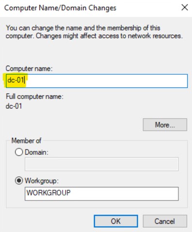 And enter the name dc-01 as my computer name. My naming scheme comes from what role my server will fulfill. Since this server will be a First Domain Controller it will be called dc-01.