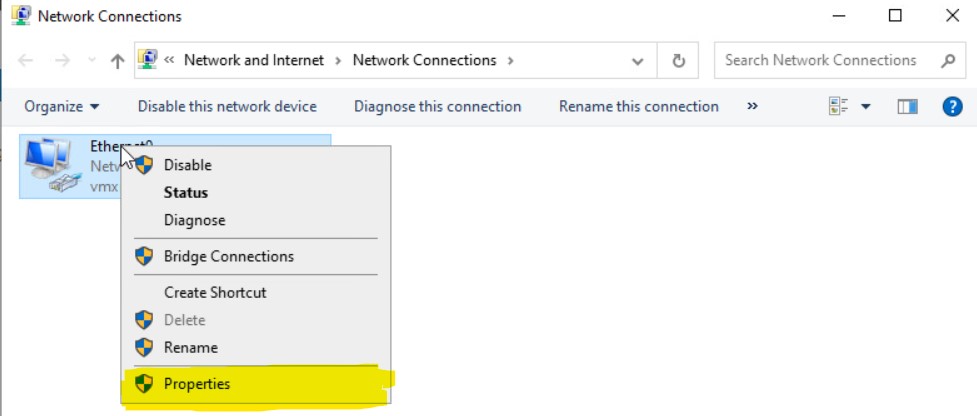 Once I'm done, I will click OK then click the Properties of Ethernet0 and lastly, I will close to network connections window.