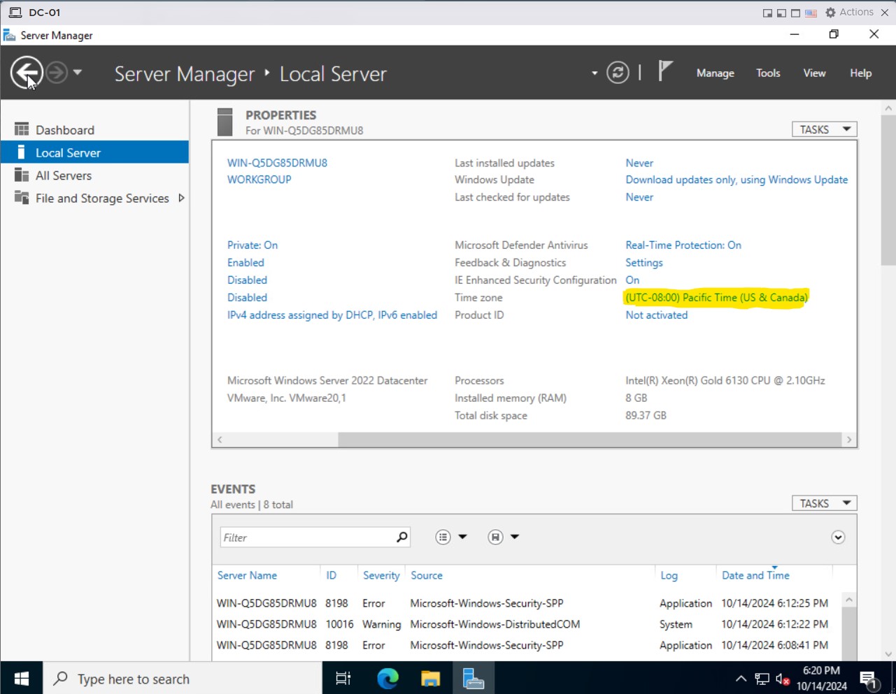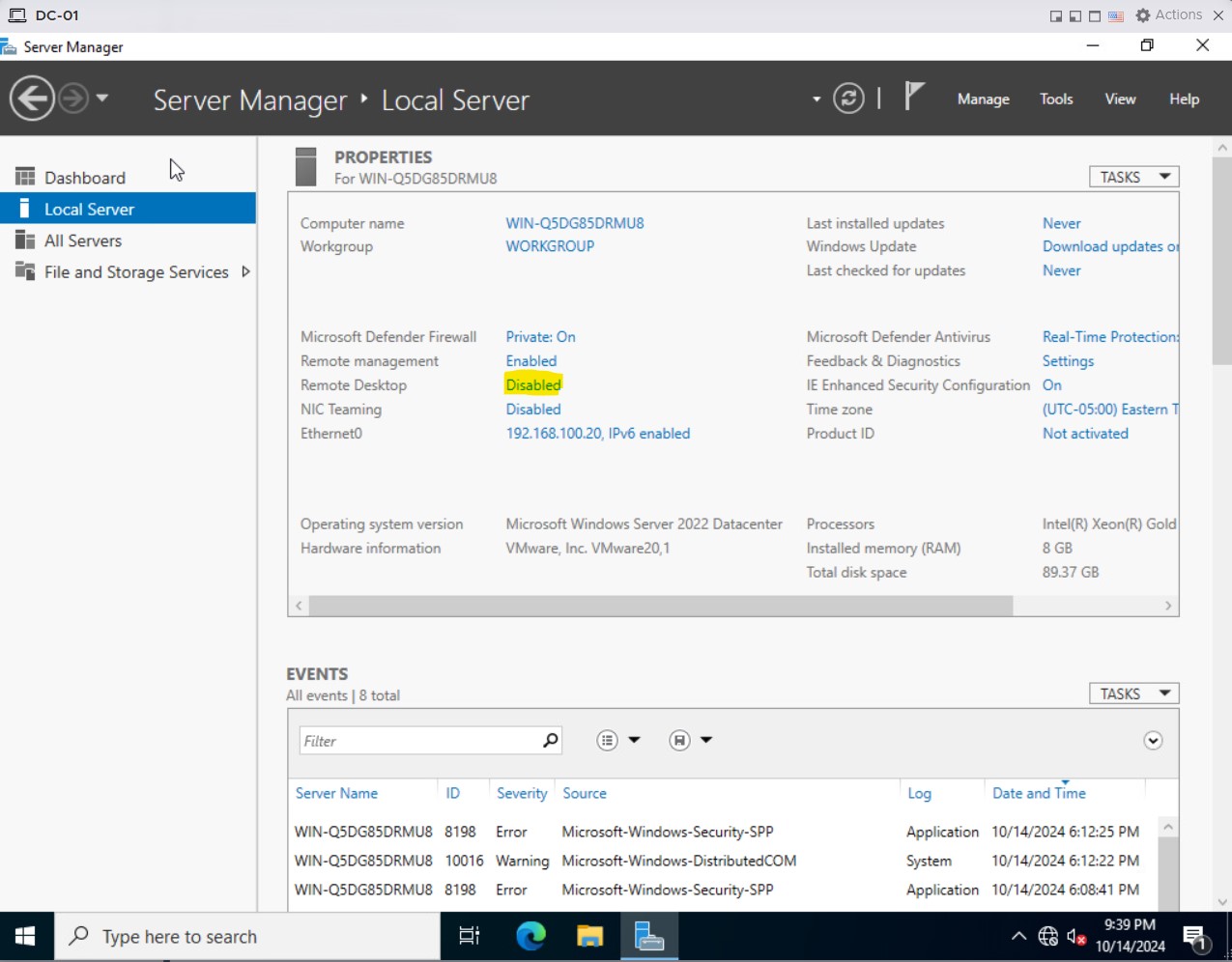 Thankfully I can do most of these directly from my Server Manager. I simply click on Local Server below Dashboard to begin: