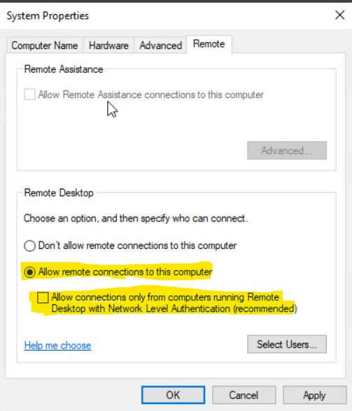 Allow Connections only from computers running Remote Desktop with Network Level Authentication (recommended) - I will uncheck this box as I will be remote into my Server through a computer that is not a part of the Domain.