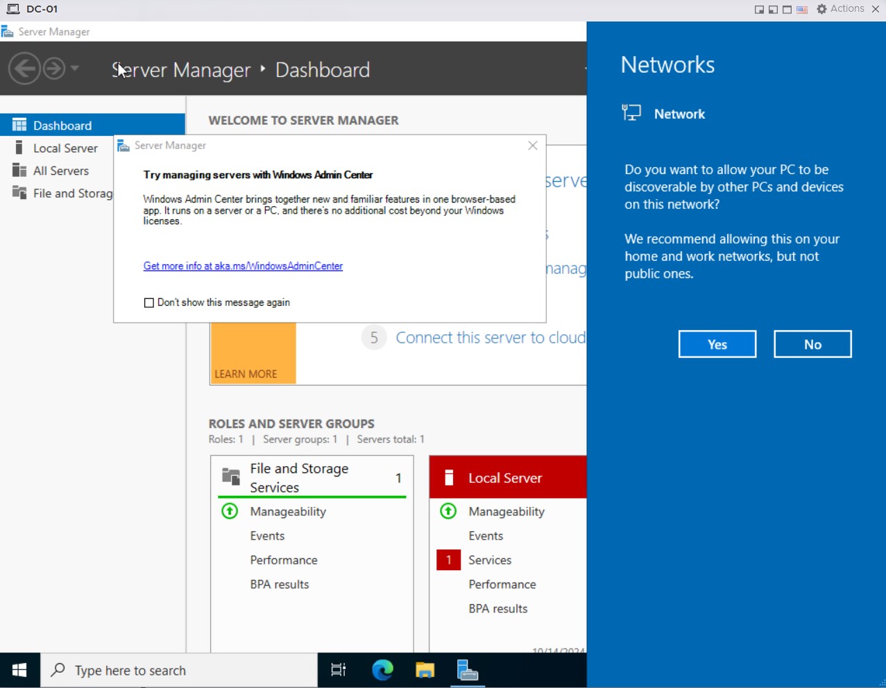 When I logged in, I'm asked if I want my PC to be discoverable by other PCs, since this is a server I will say no. You might or may not get this prompt.