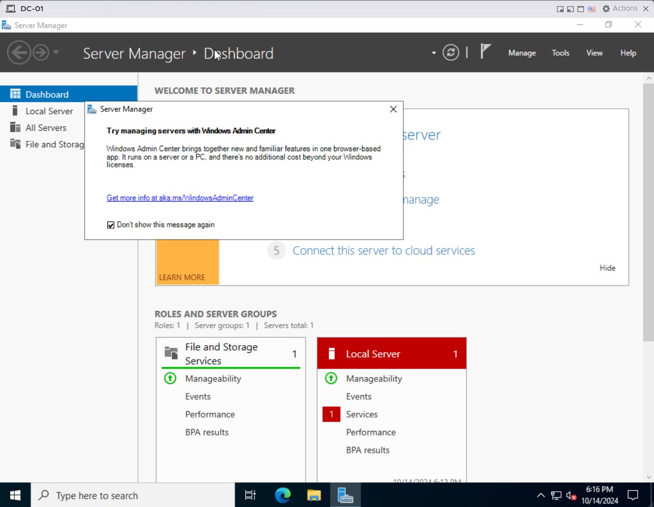 Next I am asked if I want to Manage my Windows using Windows Admin Center. I will say Don't show this message again and close it
