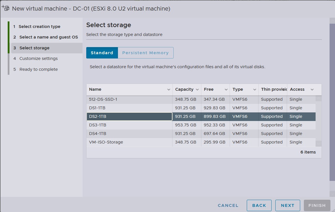 Next it will ask me where I would like to storae my virtual machine files. I have a few option but I will choose DS2-1TB and then click next: