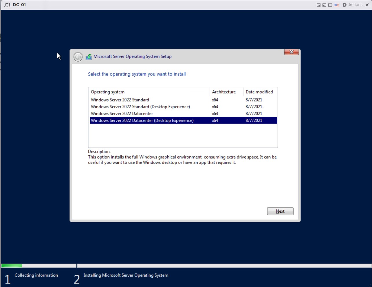 On the Select the operating system you want to install I will choose Windows Server 2022 Datacenter (Desktop Experience) has a GUI whereas Windows Server 2022 Standard and Windows Server 2022 Datacenter will install the server core version of Windows Server. NOTE: If you install Server Core you cannot enable the GUI experience, you will have to reinstall Windows