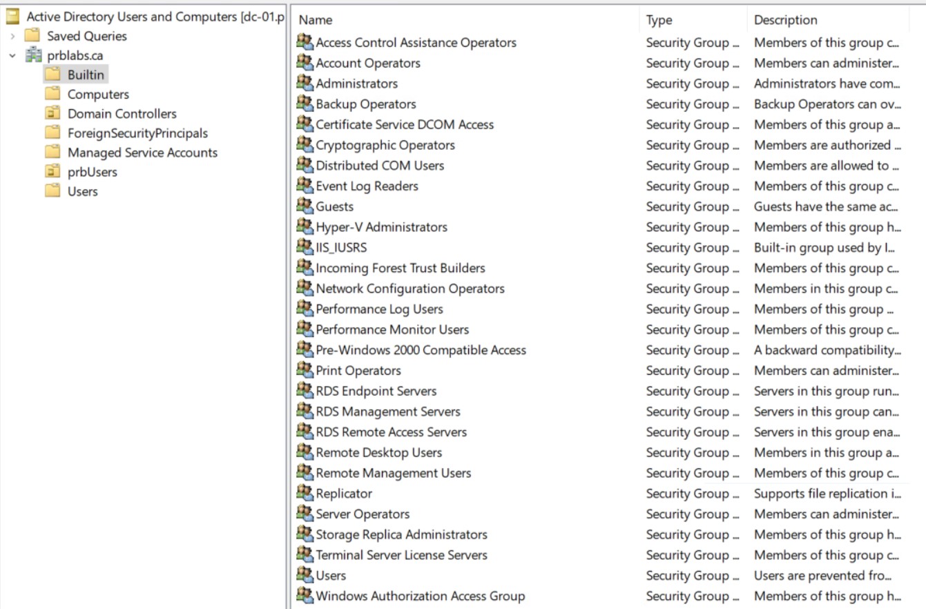 If I were to click on the BuiltIn container, I will see in the information pane that have various Security Groups. I won't go through what each of these groups are for right now, but know that these groups control access to certain resources within the Active Directory Domain. As we continue on in this project, I will using these groups to grant my user access to various resources and privileges.