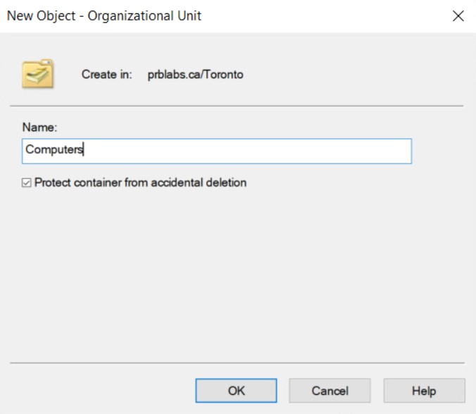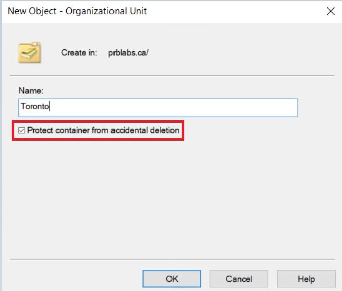 Once the New Object - Organization Unit Window comes up, you can enter the name of your Organizational unit. I will call mine Toronto but you can name yours anything you want. You will see an option at the bottom of that you can uncheck, but really, there is no reason to uncheck it. Having this box checked will prevent users from accidentally or intentionally right clicking and deleting the OU, this check-mark prevents that from happening.
