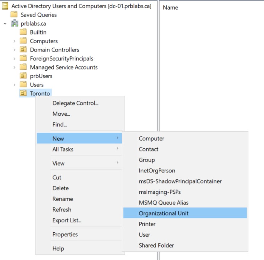 Once my Toronto OU has been created, I will proceed and create my two child OUs under Toronto. I can do this by Right-Clicking on Toronto and clicking New then Organizational Unit.