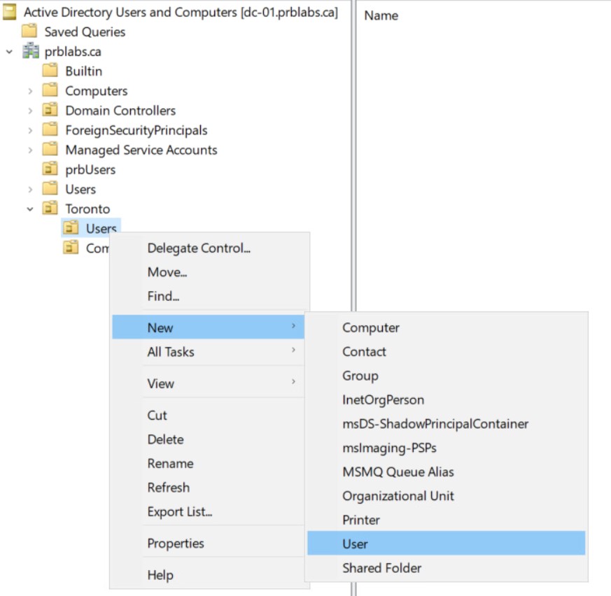 To create a user inside of Active Directory, I can right click on any of the Organizational Units or Containers within Active Directory to create my user account. Since I already have an Organizational Unit for my users I will go ahead and Right Click on my Users OU under my Toronto OU, to create this user account. Right Click on Users then New and finally User
