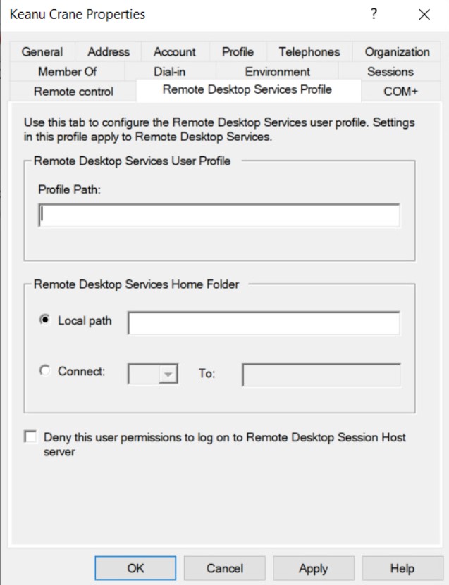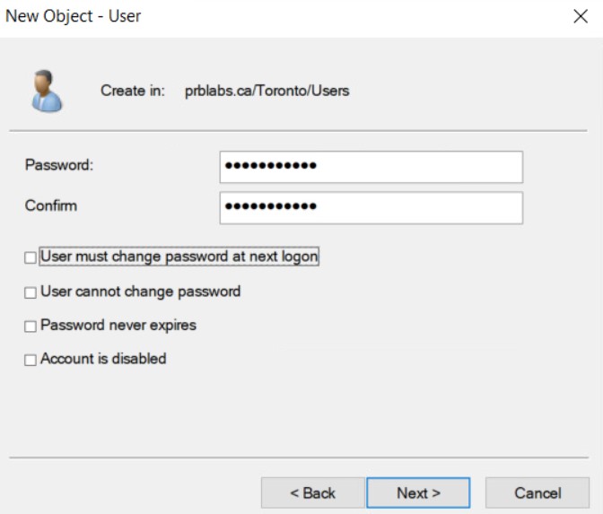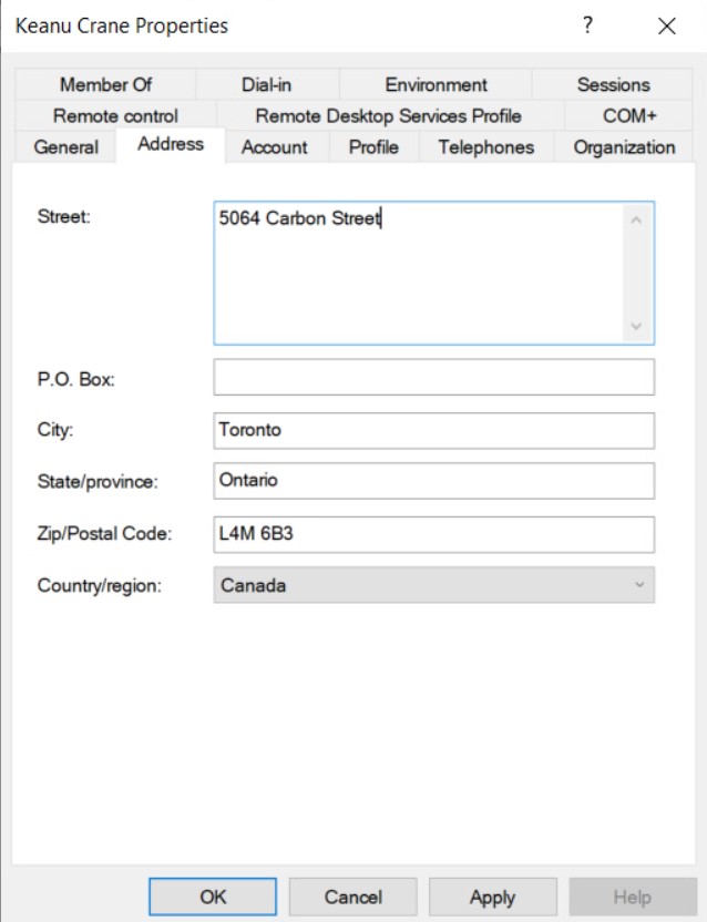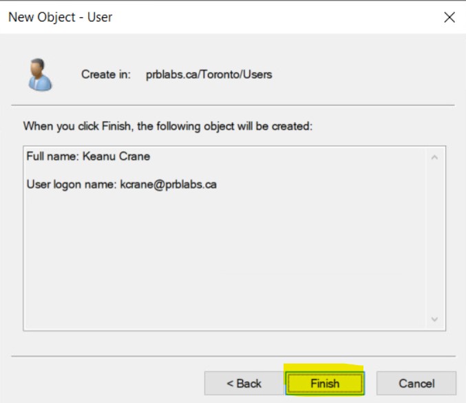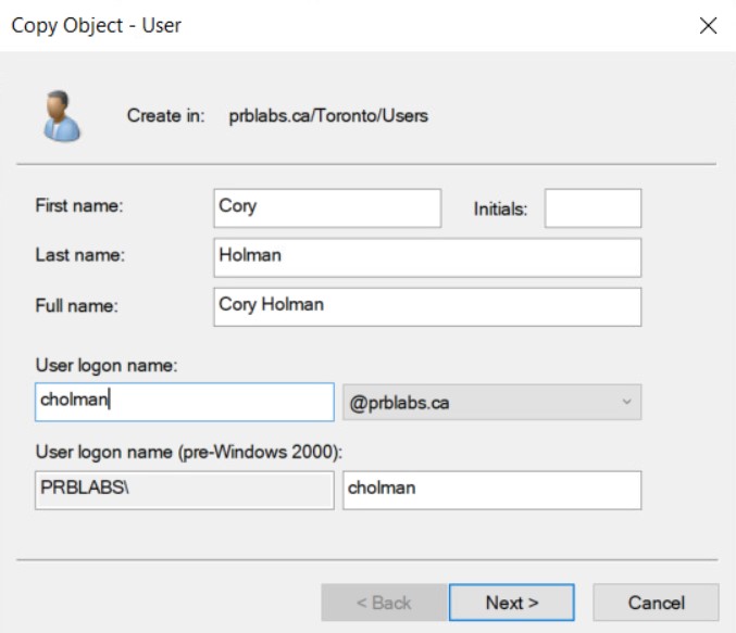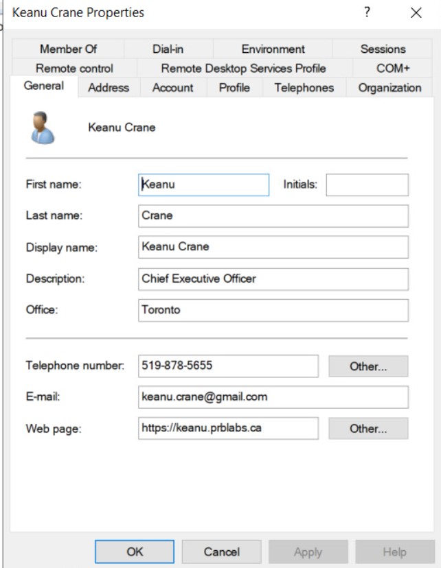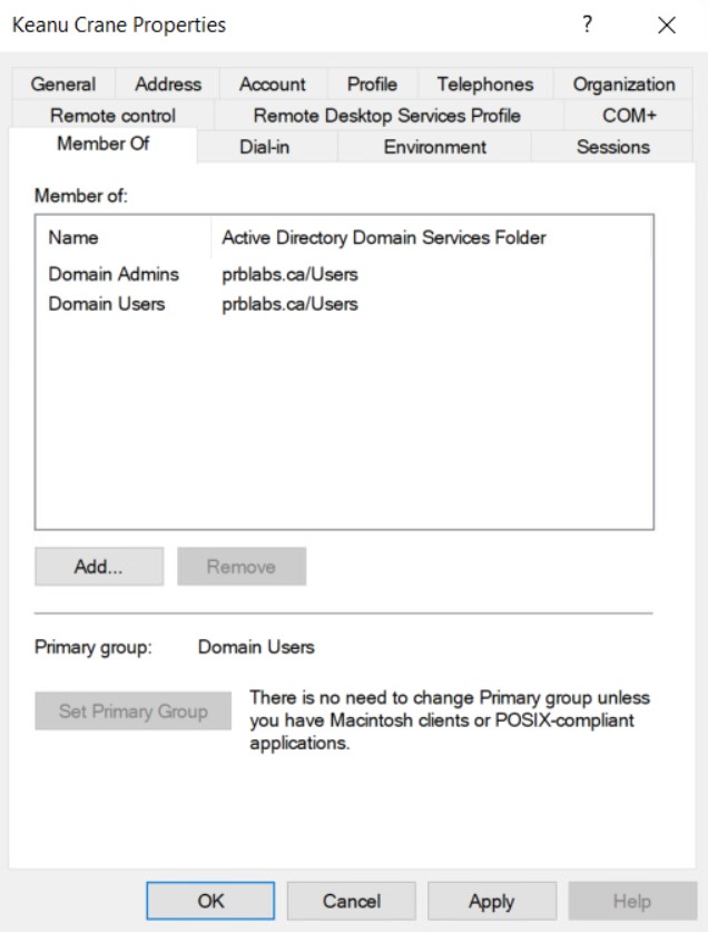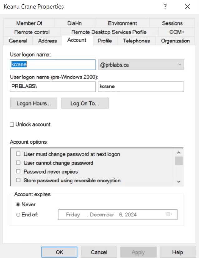 For my user Keanu Crane the User logon name will be kcrane@prblabs.ca. You will notice that the **User logon name (pre-Windows 2000): is also automatically generate. This is really just for legacy protocols and applications. Sometime you might find yourself user it.