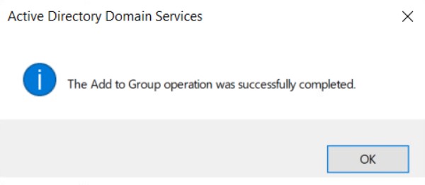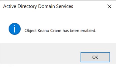 Then we will click OK and congrats, you've successfully added Keanu Crane as a member of the Domain Admin security group. You will even get a pop up box, informing you that the action was indeed successful.