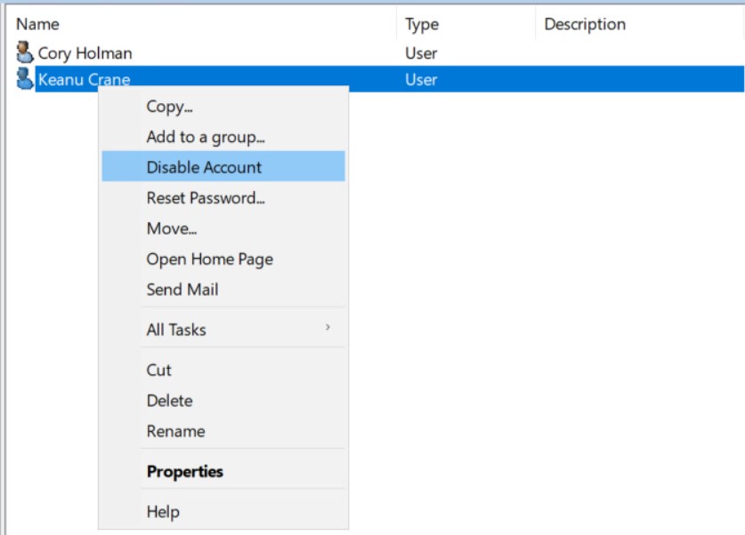 If I were to right click on my Keanu Crane user account, I can see the following information