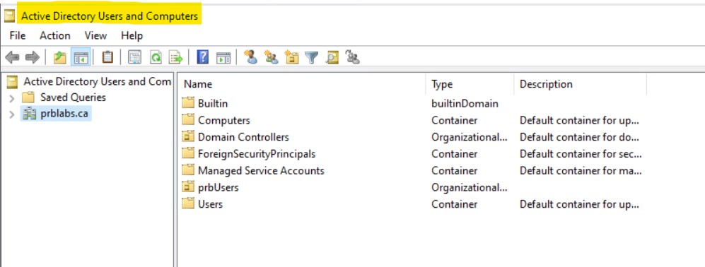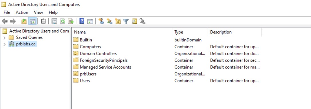 For my organization prblabs.ca, I've already created an Organization Unit called prbUsers and I've created two user accounts. Prb Admin and Prb User 1.