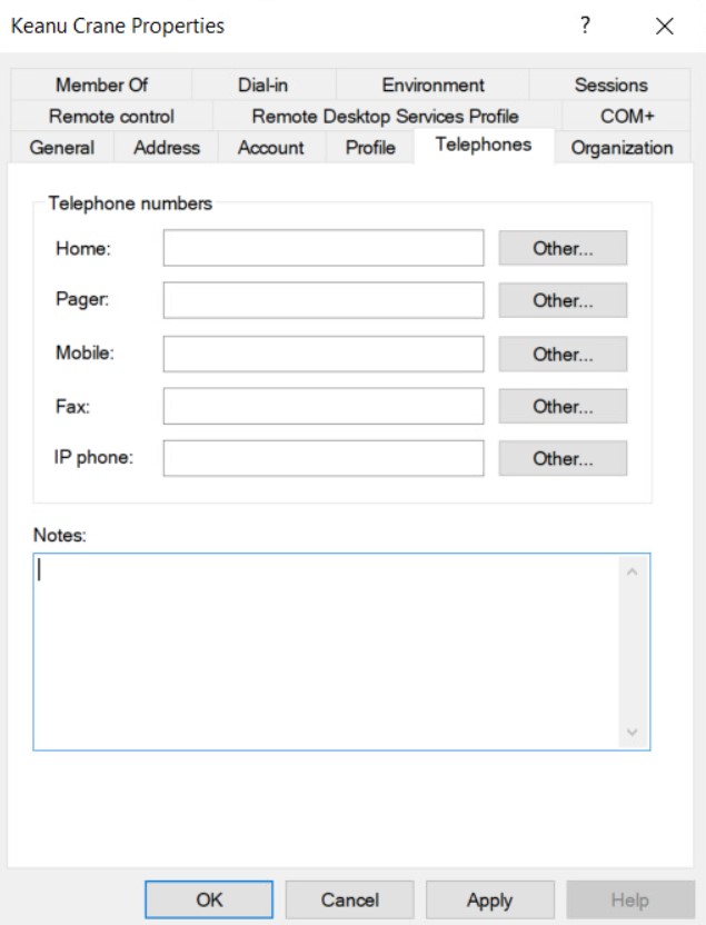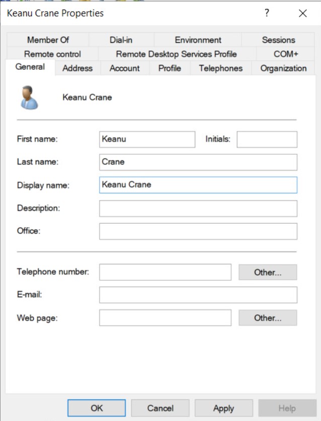 Perform this task will bring up the New Object - User window. From here you have some information to fill in. Let's see we're creating a user account for our CEO of Prblabs. And his name is Keanu Crane. We can start filling in this information.