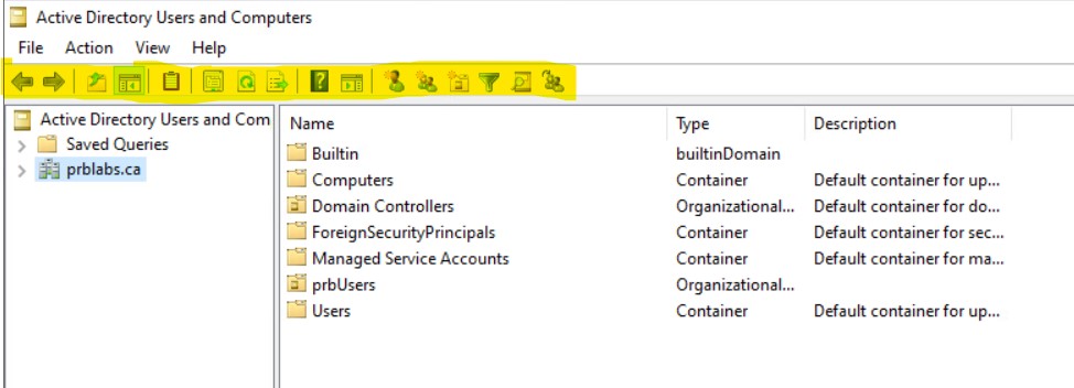 You will see that you have a few items that already exist within Active Directory Users and Computers which were create during the installation. Although these looks like folders, they are not. These are called Organizational Units (OU) and Containers (CN). They they are use to store and organize different objects within Active Directory Users and Computers. If you look closely, you'll notice that the icons are different. The icon's that looks like the Domain Controllers and prbUsers (Note: I created the prbUsers OU during my initial installation of Active Directory on DC-01) are called Organization Unit (OU) and the rest of the icons Builtin, Computers, Keys and etc. are called Containers.